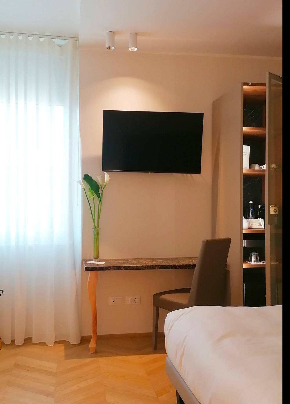 Parquet e riscaldamento a pavimento, desk in pietra e mobili Lube. A completa disposizione un mobile bar con bevande fresche, succhi di frutta, snack dolci e salati, una macchina del caffè con capsule, e un bollitore con tè e tisane per una prima colazione in autonomia.