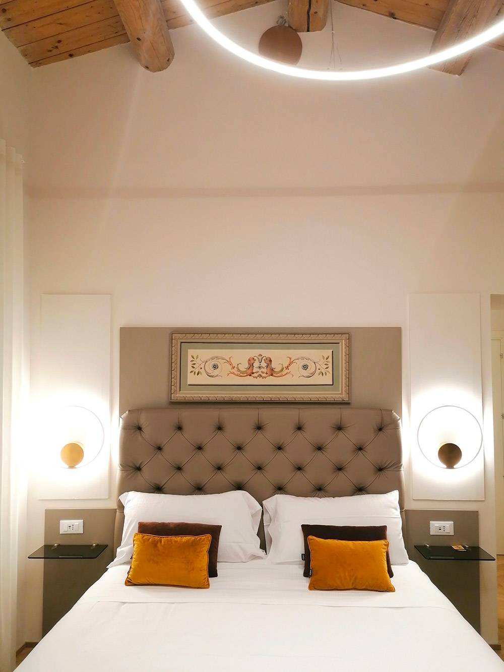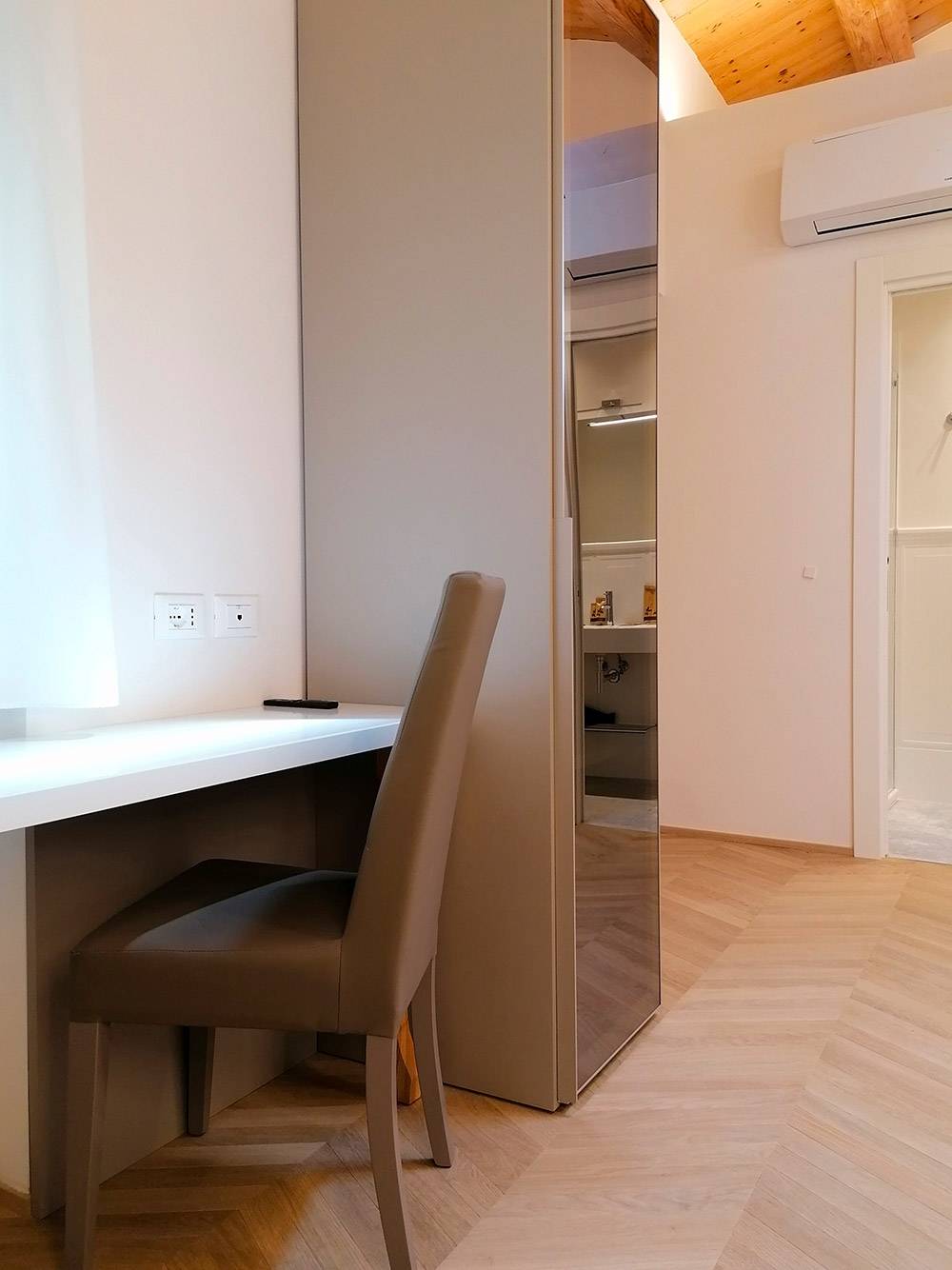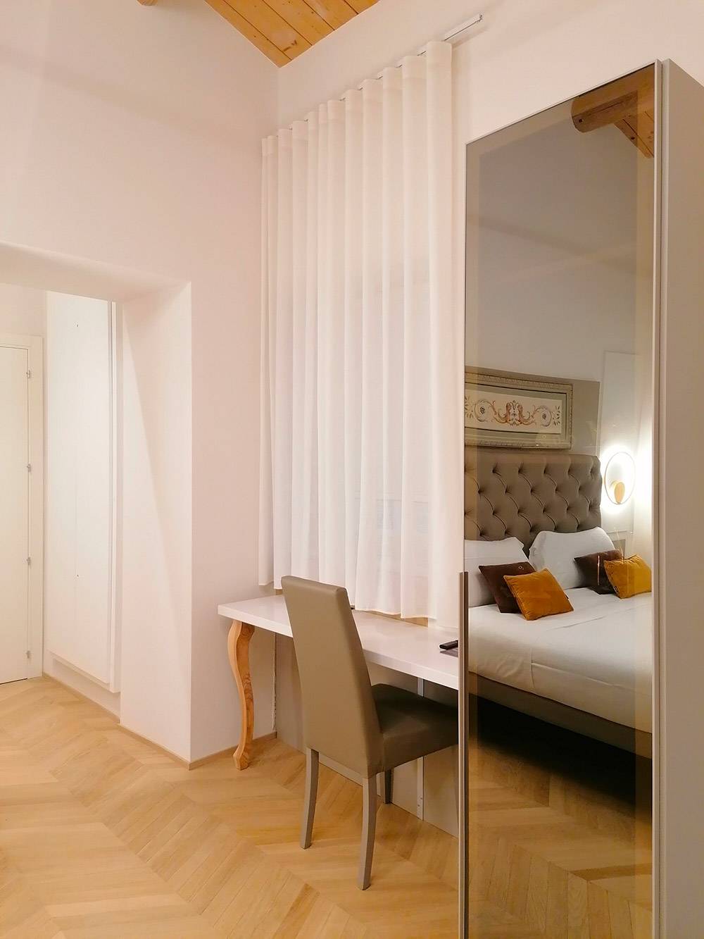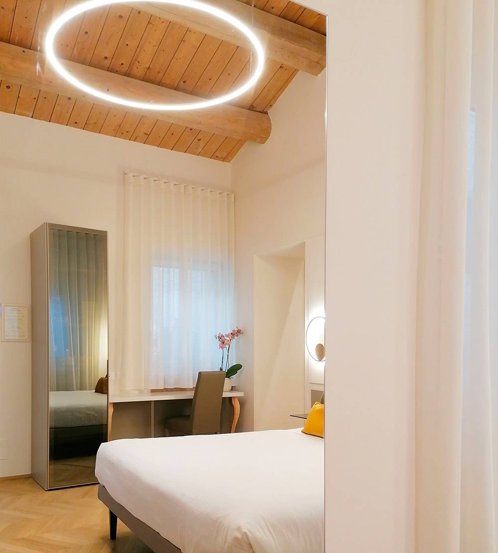 La camera Superior n. 1 è caratterizzata da ampi spazi, soffitto con travi a vista e finestre velux con tende automatizzate, parquet e riscaldamento a pavimento, scrivania in pietra e mobili Lube.
