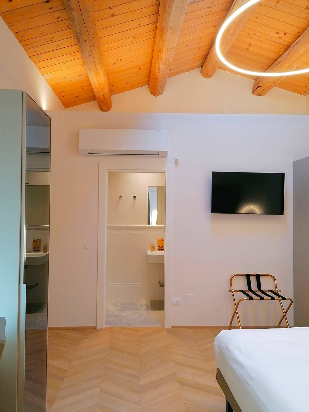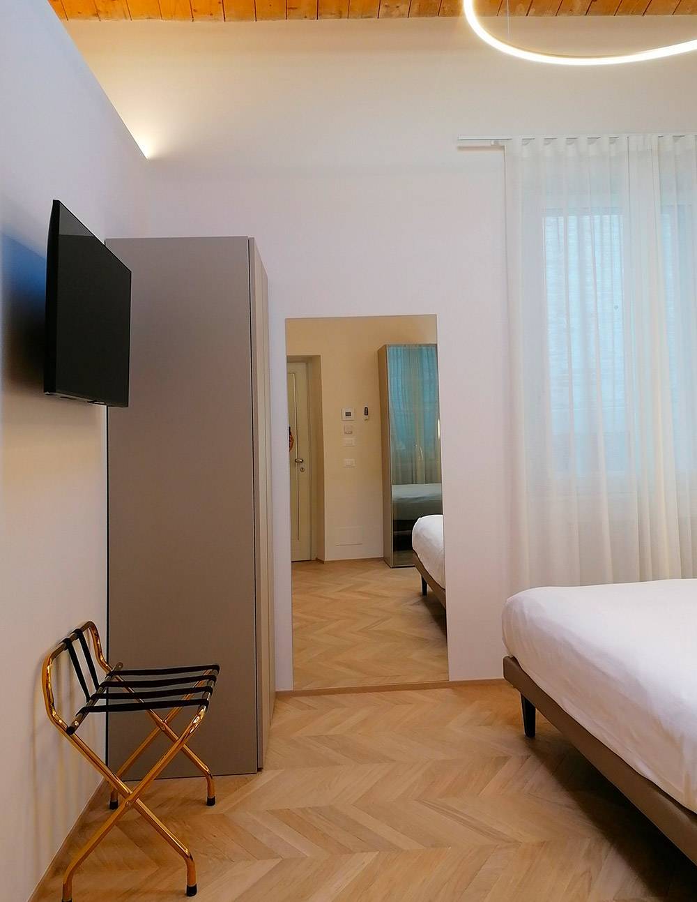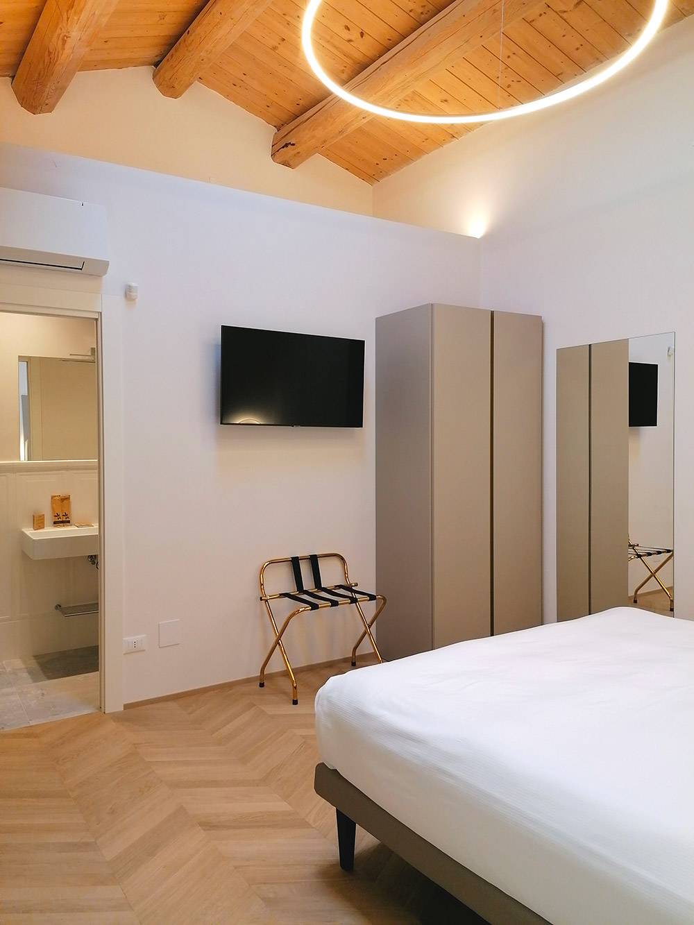 La camera Superior n. 1 è caratterizzata da ampi spazi, soffitto con travi a vista e finestre velux con tende automatizzate, parquet e riscaldamento a pavimento, scrivania in pietra e mobili Lube.